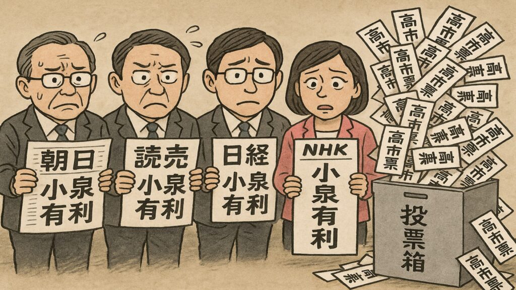 党員・党友票では高市氏が圧倒的な支持を集め、最終的に逆転を果たしました。この結果は、日本経済新聞、読売新聞、朝日新聞、NHKを含む主要報道機関の事前予想をすべて覆すものでした。特にNHKと朝日は「小泉氏優勢」「高市は保守層中心で伸び悩む」と報道していましたが、現実は真逆でした。