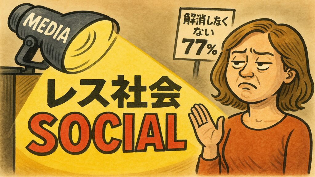 この調査では「レス解消したい」は22.7%(357人)にとどまり、77.3%(1216人)は“現状維持でよい”と回答しており、数字だけを見れば“改善を望まない層が多数派”という印象になります。しかし、この「解消したい/したくない」という強い二択は、回答を誘導しやすい形式でもあります。